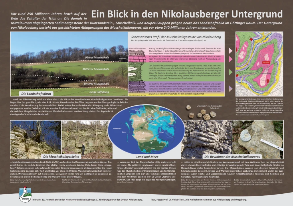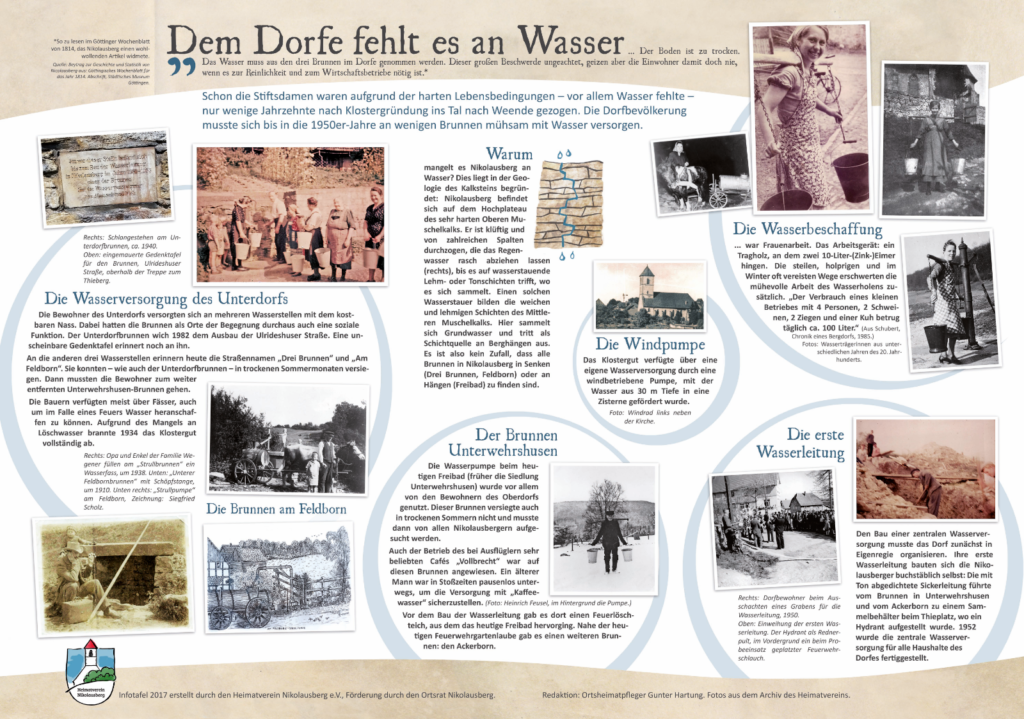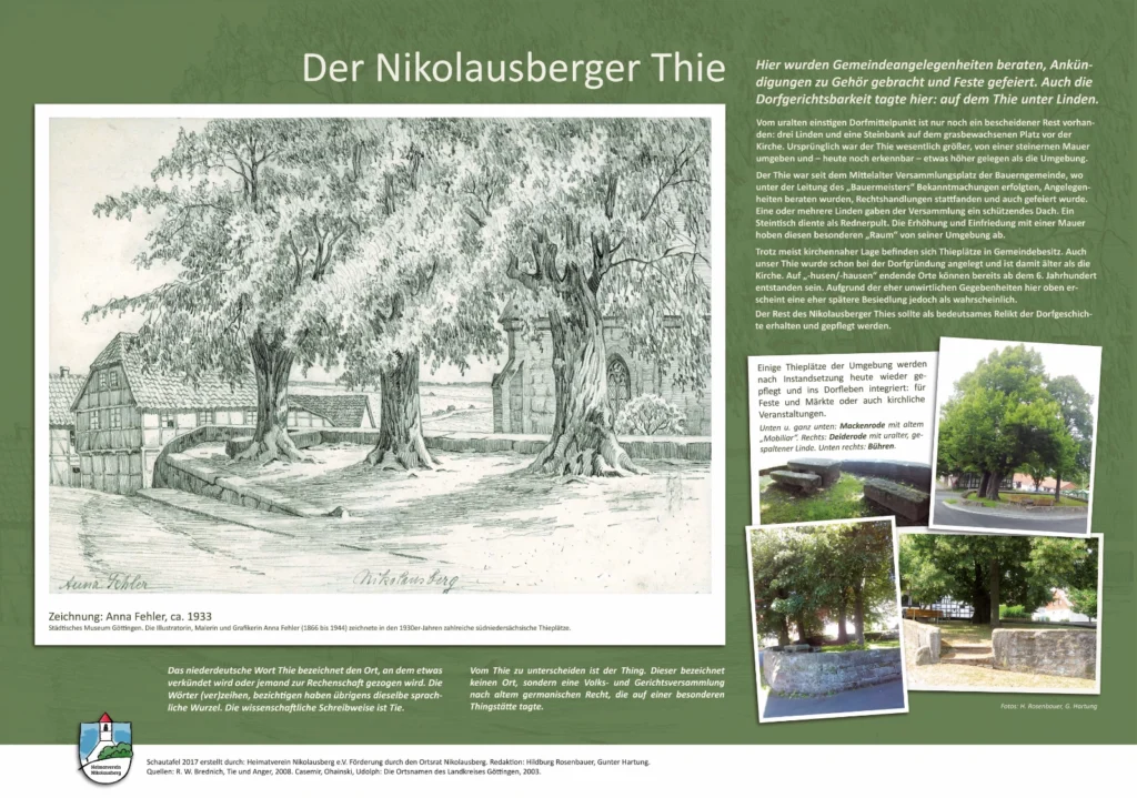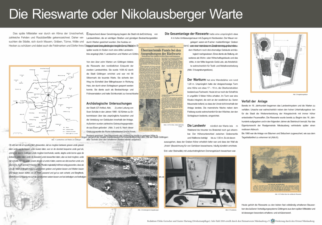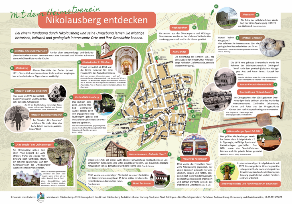 Mit Unterstützung des Ortsrats hat der Heimatverein Nikolausberg Informationstafeln angefertigt und im Ort aufgestellt. In einer Größe von 70 x 90 cm informieren sie über die geologischen Besonderheiten, die spezielle Problematik der Wasserversorgung, die Geschichte des Thieplatzes und mittels einer Karte mit eingezeichneten Standorte, über Besonderheiten und interessante Einrichtungen des Ortes. Auch für die Rieswarte wurde eine Infotafel erstellt. Sie können sich gleich online informieren. Oder Sie machen einen kleinen Spaziergang zu den Standorten.